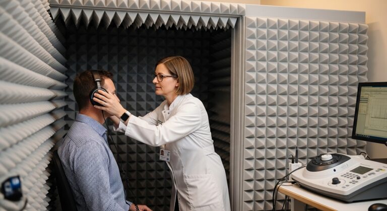 Ao entender o que é audiometria, é importante saber como o procedimento acontece. Primeiramente, o paciente entra numa cabine que isola ruídos externos para garantir precisão.